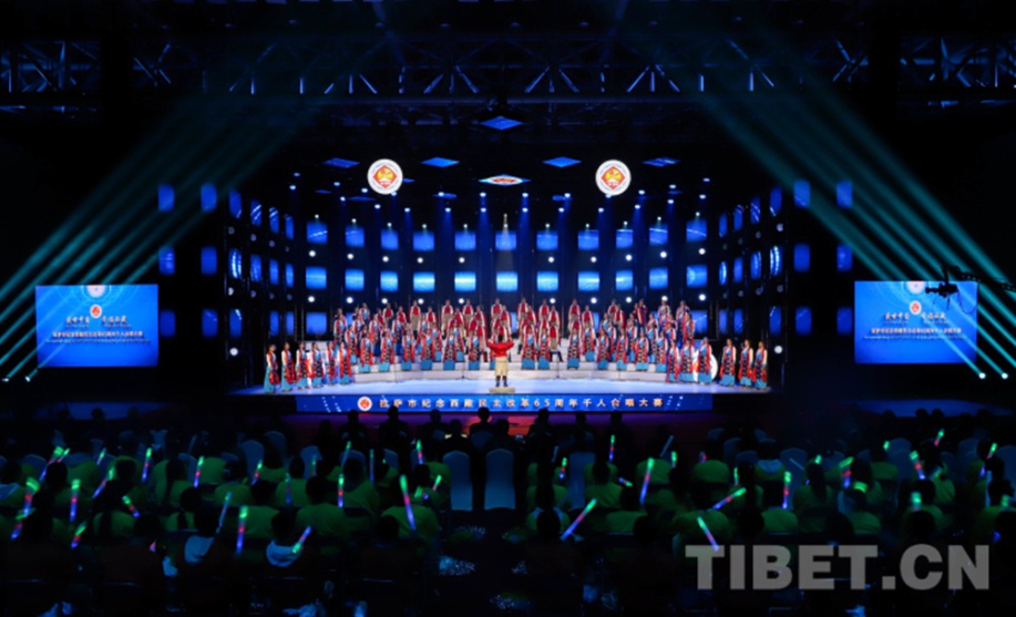 圖為西藏自治區(qū)拉薩市紀(jì)念西藏民主改革65周年千人合唱大賽在拉薩師范高等專(zhuān)科學(xué)校體育館舉行
