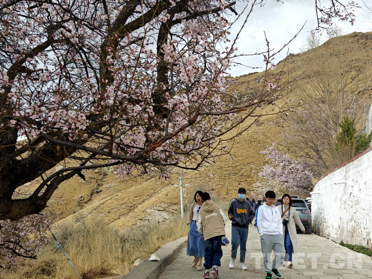 圖為帕邦喀古建筑與桃樹同框的畫面