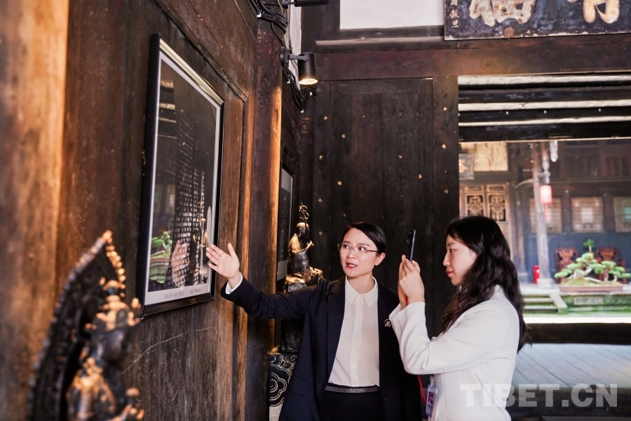 姜氏古茶第十五代傳承人萬姜紅(左)在中國西藏網(wǎng)視頻號直播時(shí)向廣大網(wǎng)友介紹姜家大院歷史和有關(guān)老照片的故事 楊洋供圖