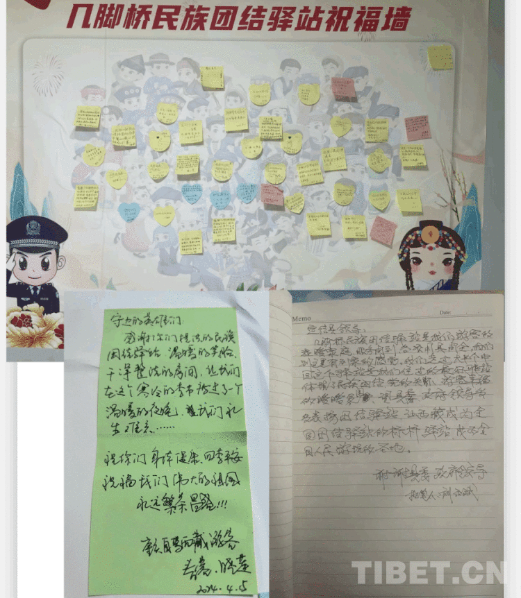 記者在社交媒體上也看到了很多游客以視頻、圖文等形式分享了他們和幾腳橋民族團(tuán)結(jié)驛站的故事?!耙?yàn)楫?dāng)?shù)靥厥庠蛭覀兊娇h城沒有地住了,在小紅書上看到這個(gè)驛站可以留宿,實(shí)在沒有辦法去邊防檢查站詢問。邊防小哥哥了解原因后特別暖心立馬給我們安排住宿,洗漱用品樣樣不差,太贊啦!這是我這一路旅行睡得最香的一晚,主要還免費(fèi)!”一位游客半調(diào)侃地分享了自己的故事,還加了三張夜拍驛站的圖片。一張用外景,在夜里,“幾腳橋民族團(tuán)結(jié)驛站”漢藏雙語大牌十分醒目;一張室內(nèi)環(huán)境,左右兩邊的上下鋪床上放著四個(gè)“豆腐塊”被子,床單潔白如新,中間的小桌子上還放著氧氣罐、雜志、臺(tái)燈等用品;一張貼滿祝福與感謝的“便簽墻”……張張圖片體現(xiàn)了驛站工作人員的用心良苦,也定格著他難忘的定結(jié)記憶。