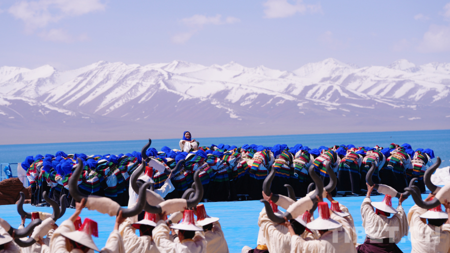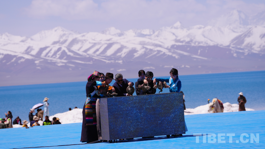 念青唐古拉山脈皚皚雪山高聳入云,清澈碧藍的納木錯湖水一望無際,牧民牽著白牦牛在湖邊悠閑地散步,成群的棕頭鷗發(fā)出歡快的叫聲在空中自由飛翔……在令人如癡如醉的絕美景色為背景的祈福儀式上,身著盛裝的300名演員結合當?shù)孛袼孜幕?,手捧哈達、牛角、烏爾朵(拋石器)等呈現(xiàn)盛大的祈福儀式,給現(xiàn)場觀眾帶來一場羌塘高原別具一格的視覺盛宴。