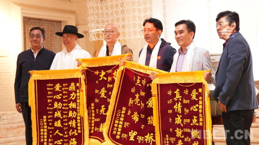 活動(dòng)最后,中國藏學(xué)出版社向拉薩市特殊教育學(xué)校學(xué)生贈(zèng)送繪畫用品,拉薩市特殊教育學(xué)校云旦平措校長、尼瑪書記向現(xiàn)場來賓贈(zèng)送新書。
