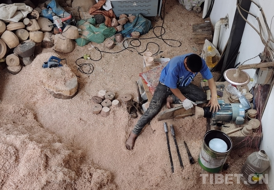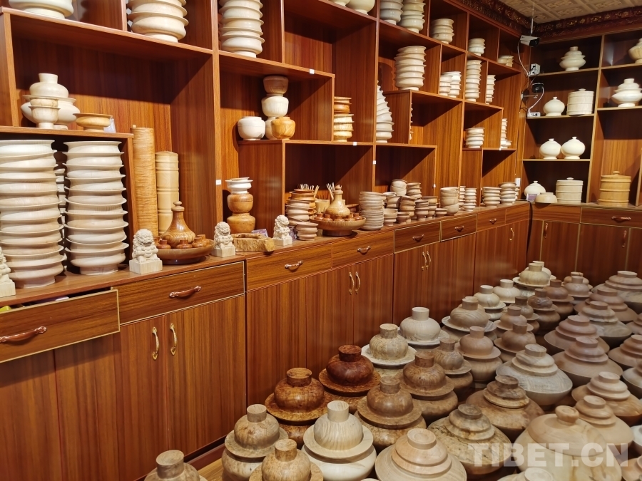 我們首先來到的是四川省非物質(zhì)文化遺產(chǎn)項(xiàng)目——藏族民間車模技藝體驗(yàn)基地?;匾粚邮枪ぷ鲄^(qū),一位師傅正在全身心制作木質(zhì)生活用具,絲毫沒有察覺我們的到來。于是沒有過多打擾,我們徑直來到二樓展品陳列區(qū)。藏族民間車模技藝傳承人格絨次仁的兒子洛絨次仁拿起一個(gè)木碗,臉上露出樸實(shí)而靦腆的微笑介紹道,“這些都是選用樹瘤制作而成,一般選用鵝掌木、杜鵑等15類樹木,因?yàn)橹蹦救菀琢验_。為了用具不裂開,處理后的樹瘤煮水后需晾干五至六個(gè)月,一個(gè)木碗制作工序可能要長達(dá)半年才能完成。此項(xiàng)技藝在家族傳承至今已有四代,我們要做就做好一點(diǎn)?!甭褰q次仁大哥希望更多人能了解這項(xiàng)非物質(zhì)文化遺產(chǎn),有更多人愿意來傳承學(xué)習(xí)這份技藝,有更多人喜歡他們制作的這些木質(zhì)生活用具。