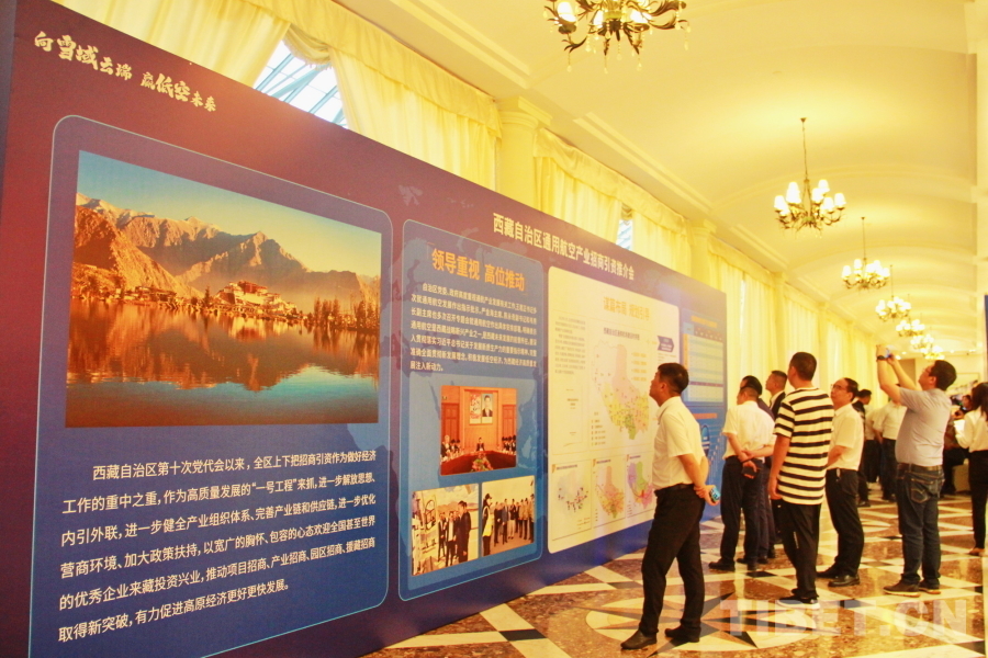 圖為西藏自治區(qū)通用航空產(chǎn)業(yè)招商引資推介會現(xiàn)場設(shè)置的展板吸引與會嘉賓駐足了解 攝影:劉莉