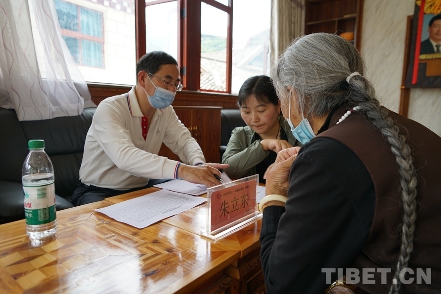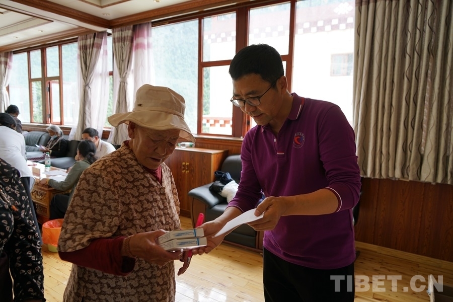 得知有來自北京的醫(yī)療專家為大家義診,家住白玉縣城的切呷一大早便帶著父母來到了義診現(xiàn)場。她的母親澤仁拉嘎今年75歲,自述下肢從腰間、腿部到腳尖都會發(fā)麻、有疼痛感,行走時腰部會很累,偶爾還會因為控制不好腿部活動而摔倒。北京水利醫(yī)院創(chuàng)傷骨科副主任醫(yī)師王耀輝在經(jīng)過詳細問診后,為拉嘎阿媽開具了營養(yǎng)神經(jīng)的藥品,并建議她進一步做胸椎和腰椎方面的檢查。