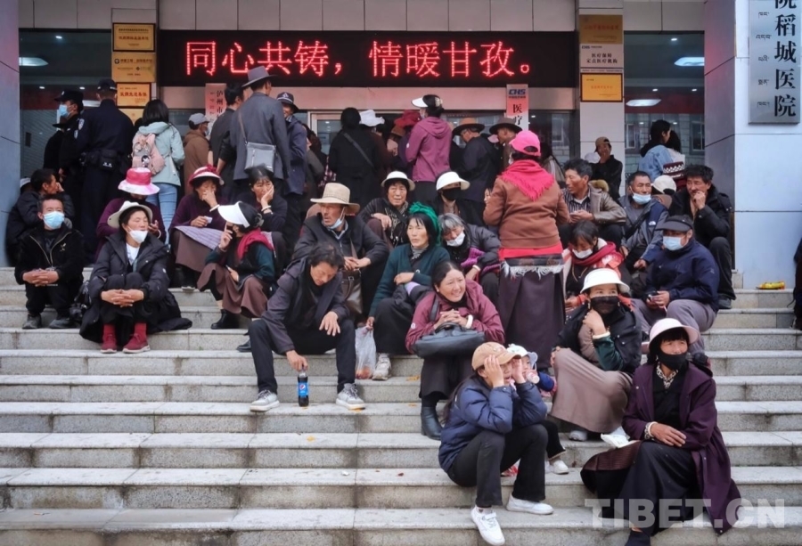 圖為7月8日,在稻城縣人民醫(yī)院門(mén)口,當(dāng)?shù)厝罕娫诘却刑?hào)、分診