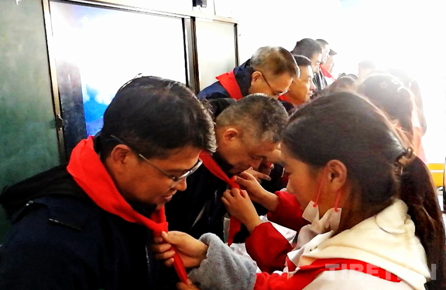 圖為四川省甘孜州石渠縣第二完全小學(xué)學(xué)生為醫(yī)療專家們獻上鮮艷的紅領(lǐng)巾 攝影:劉莉