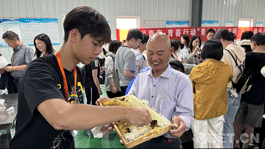 7月11日,140余名香港青少年帶著對(duì)知識(shí)的渴望來到海南州貴德縣,踏上了生態(tài)研學(xué)之旅。在青藏華峰中蜂蜂業(yè)有限公司保種場(chǎng)(以下簡(jiǎn)稱保種場(chǎng)),群山環(huán)抱,樹木蔥蘢的山坡里分布著許多蜂箱,同學(xué)們?cè)邳S河岸邊與中華蜜蜂來了場(chǎng)親密邂逅。