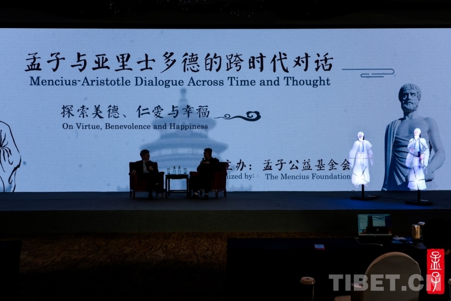 儀式上,以孟子與亞里士多德為人物形象的全息影像對(duì)話逐步展開。孟子公益基金會(huì)理事長(zhǎng)孟亮與聯(lián)合國(guó)可持續(xù)發(fā)展解決方案網(wǎng)絡(luò)主席杰弗里?薩克斯作為對(duì)話人。此次對(duì)話聚焦孟子和亞里士多德對(duì)美德、仁愛(ài)的詮釋,以及兩者之間存在的共通性等。包括孟亮和薩克斯的對(duì)話環(huán)節(jié)、現(xiàn)場(chǎng)嘉賓的提問(wèn)環(huán)節(jié)。全息影像形式新穎,現(xiàn)場(chǎng)問(wèn)答氣氛活躍,實(shí)現(xiàn)了一場(chǎng)中西方文明跨越時(shí)間與空間的對(duì)話。(中國(guó)西藏網(wǎng) 記者/趙婧茹)