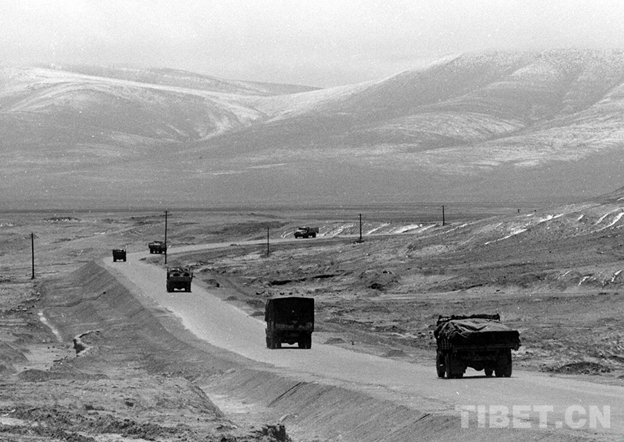 汽車車隊(duì)行駛在茫茫的唐古拉山區(qū)段(唐召明1987年攝)