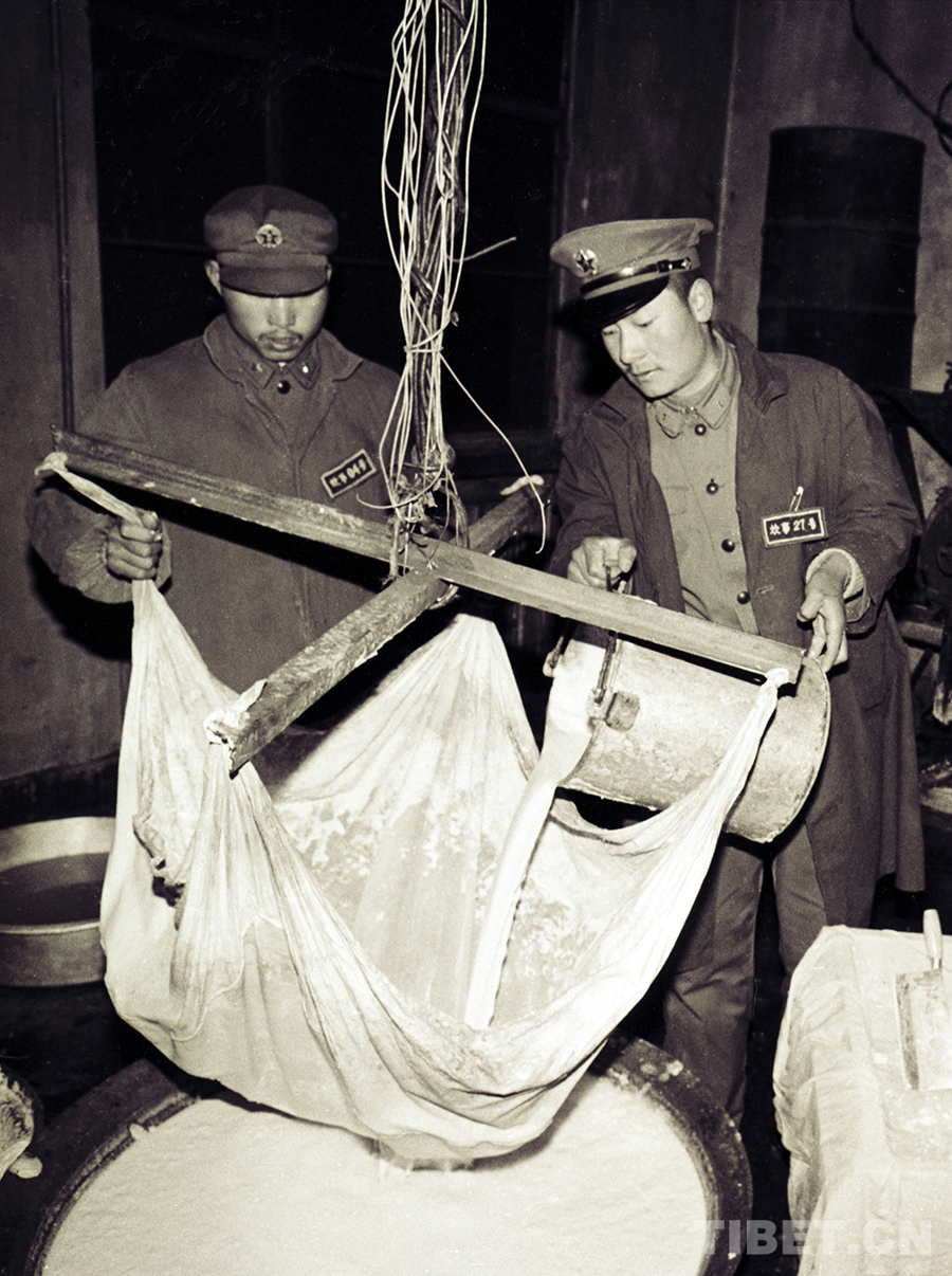 五道梁兵站戰(zhàn)士正在制作豆腐。在風(fēng)雪青藏公路線上,它豐富了過(guò)往人員就餐的“菜盤子”(唐召明1987年攝)