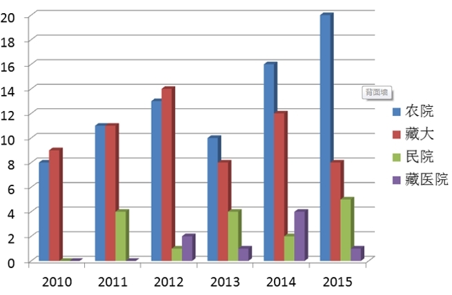 圖為2010-2015年西藏四所高校獲批國家基金情況