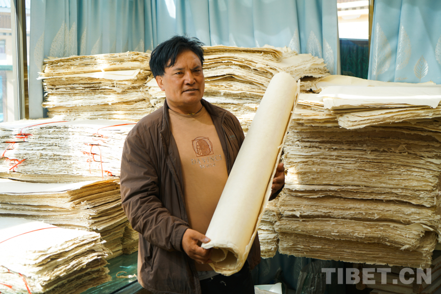 圖為多登在展示自己制作的藏紙 攝影:趙振宇