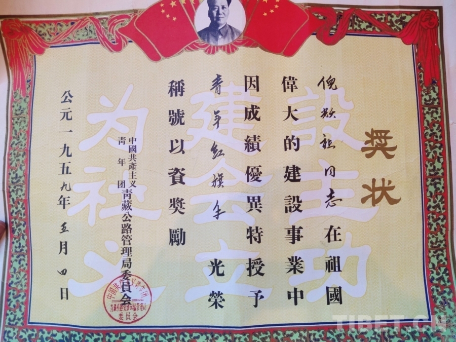 圖為1959年,中國共產(chǎn)主義青年團(tuán)青藏公路管理局委員會授予倪躍祖青年紅旗手光榮稱號的獎狀
