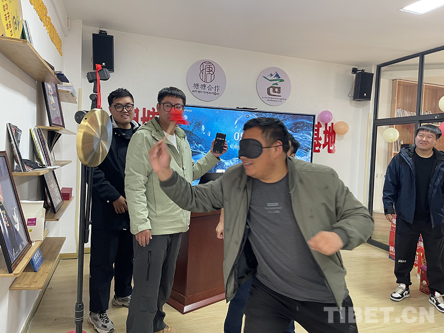 猜燈謎、投壺、蒙眼敲鑼等活動(dòng)相繼舉行,現(xiàn)場(chǎng)熱鬧非凡。投壺是中國(guó)古代一種博弈助興的游藝,專技人才們參與積極性極高,紛紛尋找角度,穩(wěn)住心態(tài),瞄準(zhǔn)壺口投射,投中者贏得陣陣掌聲;蒙眼敲鑼的環(huán)節(jié)將本次活動(dòng)推向了高潮,大家自由結(jié)對(duì),接力在蒙住雙眼的條件下,僅憑借隊(duì)友的引導(dǎo)敲響銅鑼。