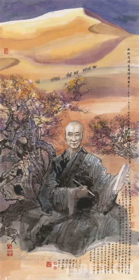 圖為尼瑪澤仁繪制并捐贈給鳩摩羅什寺的國畫作品《絲路高僧學(xué)者鳩摩羅什》