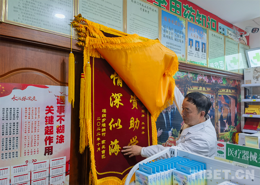 不僅如此,朱祥務(wù)還經(jīng)常主動(dòng)為病人減免藥費(fèi)。在藥房收銀臺(tái)后的墻上,掛著一塊顯眼的“雙擁門(mén)店”的標(biāo)牌,上寫(xiě)“退役軍人、現(xiàn)役軍人、消防指戰(zhàn)員全場(chǎng)9折”,一個(gè)月下來(lái),藥房光折扣掉的費(fèi)用就高達(dá)十多萬(wàn)。對(duì)于五保戶(hù)、殘疾人員、當(dāng)?shù)氐睦щy群眾和外地務(wù)工的民工,朱醫(yī)生大藥房提供免費(fèi)看診。在采訪期間,就有一位來(lái)自搬遷村的居民走進(jìn)藥房,默默地取走了需要的藥品?!皩?duì)我來(lái)說(shuō),開(kāi)藥房、診所不是為了掙錢(qián),是因?yàn)楫?dāng)?shù)厝诵枰?。?/p>