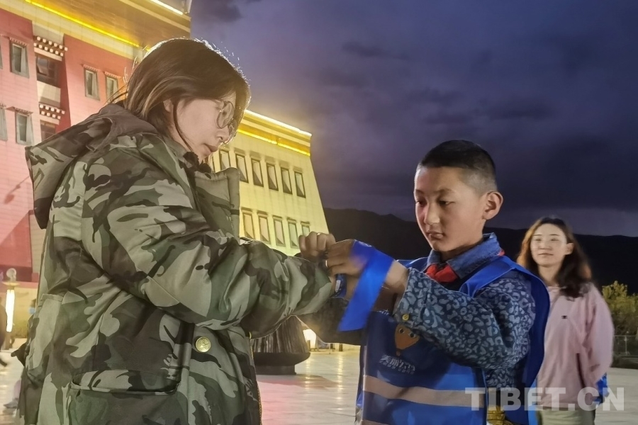 夜幕降臨,研學(xué)游團隊來到文成公主劇場。穿上藍(lán)馬甲,孩子們搖身一變成了文明旅游的小小宣傳員。帕里鎮(zhèn)小學(xué)注重培養(yǎng)學(xué)生的生態(tài)文明意識,自2023年7月起,主動加入“美麗公約”志愿組織的“擦亮天路行動”。學(xué)生定期在帕里鎮(zhèn)清理垃圾,也會為沿國道562來到帕里的游客宣傳垃圾隨身走的文明旅游理念。今天,來到拉薩,孩子們再次熟練地向劇場周圍的觀眾宣傳起來,一邊為大家在右臂系上代表文明旅游承諾的藍(lán)絲帶,一邊鼓勵“一起守護第三極,因為有你,中國更美”。一時間,文成公主劇場周圍成為了藍(lán)絲帶的海洋。