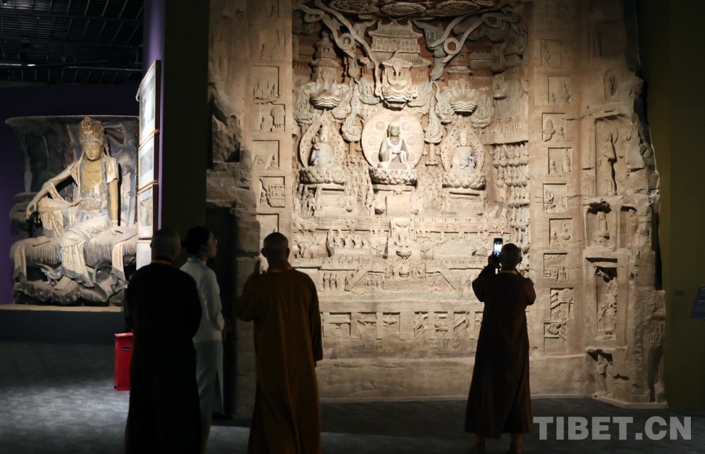 圖為與會者在“翰墨佛緣——‘中國歷代繪畫大系’佛教藝術珍品展”上參觀大足石刻北山佛灣第245龕觀無量壽佛經(jīng)變相龕(3D打印復制)