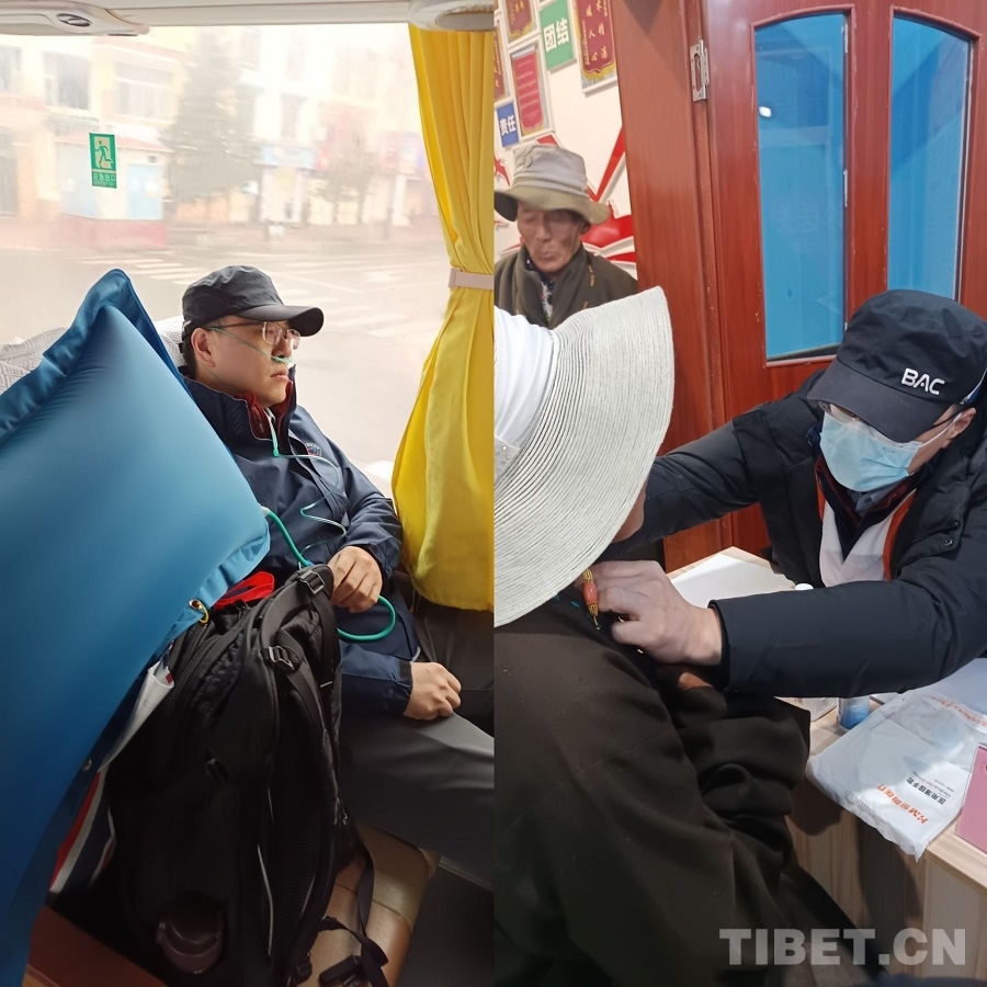 圖為前一晚抵達(dá)紅原時(shí)發(fā)燒38度的航天總醫(yī)院普外科專家蘇超云帶病前去義診(左),為當(dāng)?shù)厝罕娍丛\(右)攝影:賈春玲
