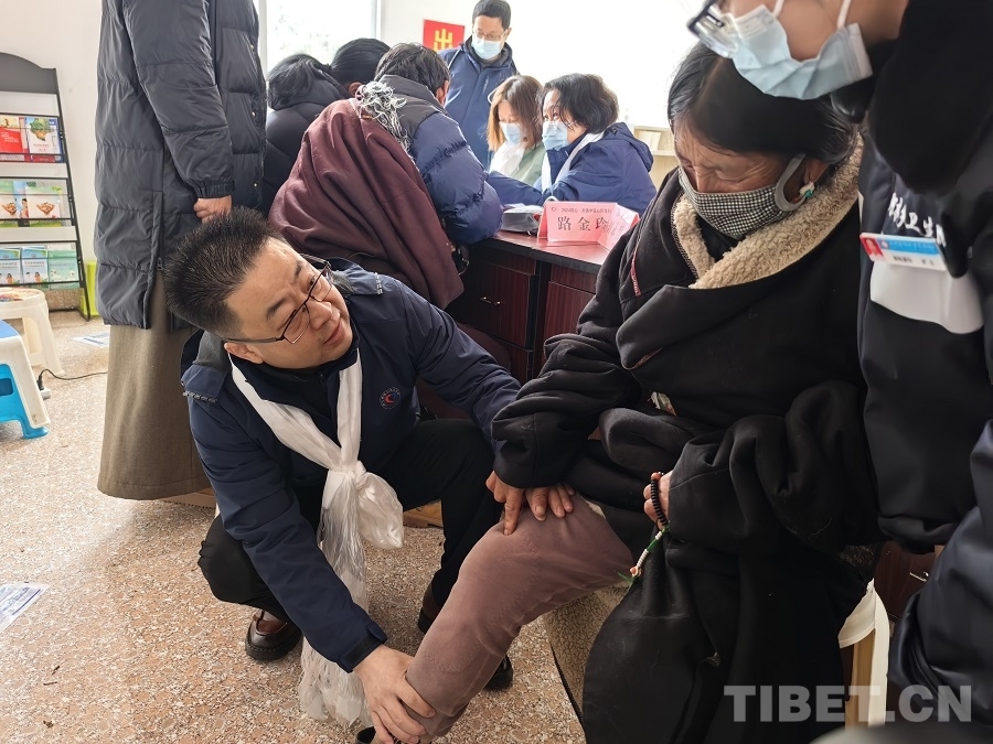 圖為中國(guó)康復(fù)研究中心骨科專家唐鵬為當(dāng)?shù)厝罕娍丛\ 攝影:賈春玲