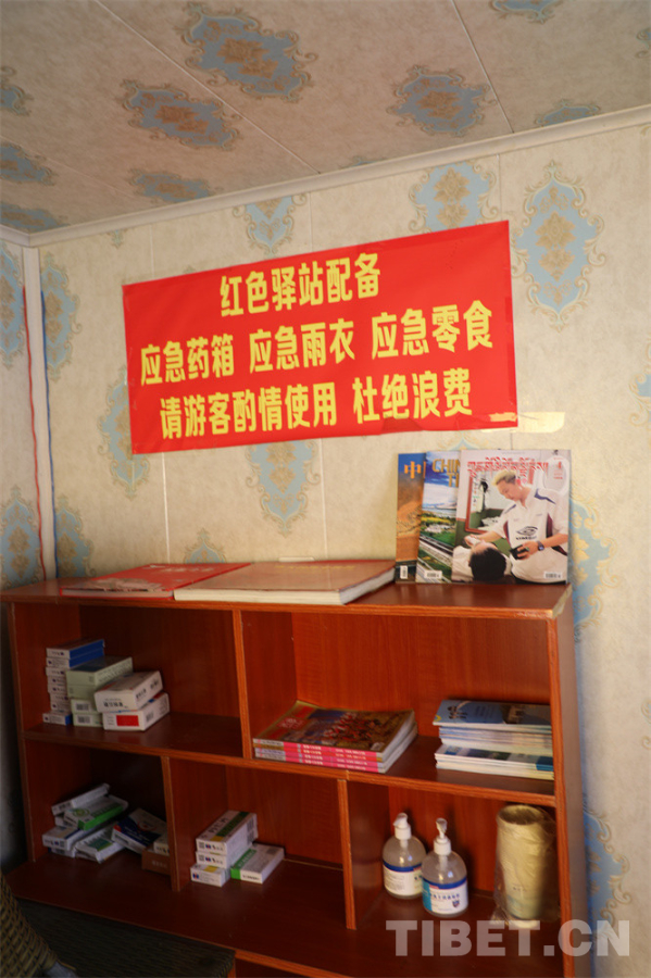 圖為佩枯錯旁邊的石榴籽紅色驛站內(nèi)免費配備的藥物、洗手液、紙杯、雜志等物品,記者也將《中國西藏》雜志擺放在內(nèi),希望給游客的旅程帶去一些收獲 攝影:王茜