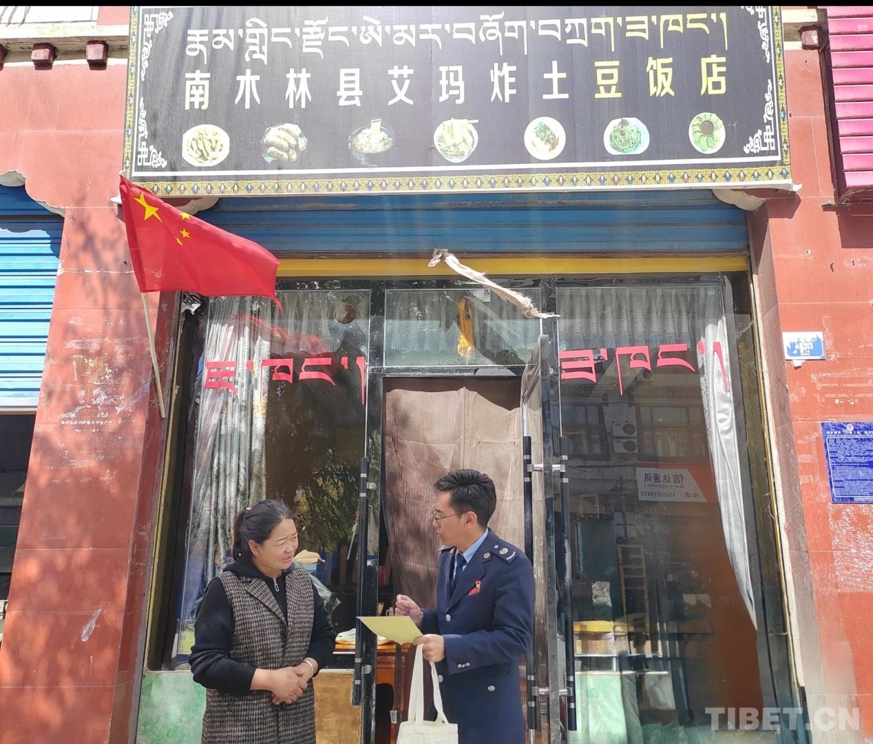 圖為稅務(wù)工作人員為南木林縣艾瑪炸土豆飯店工作人員講解相關(guān)政策