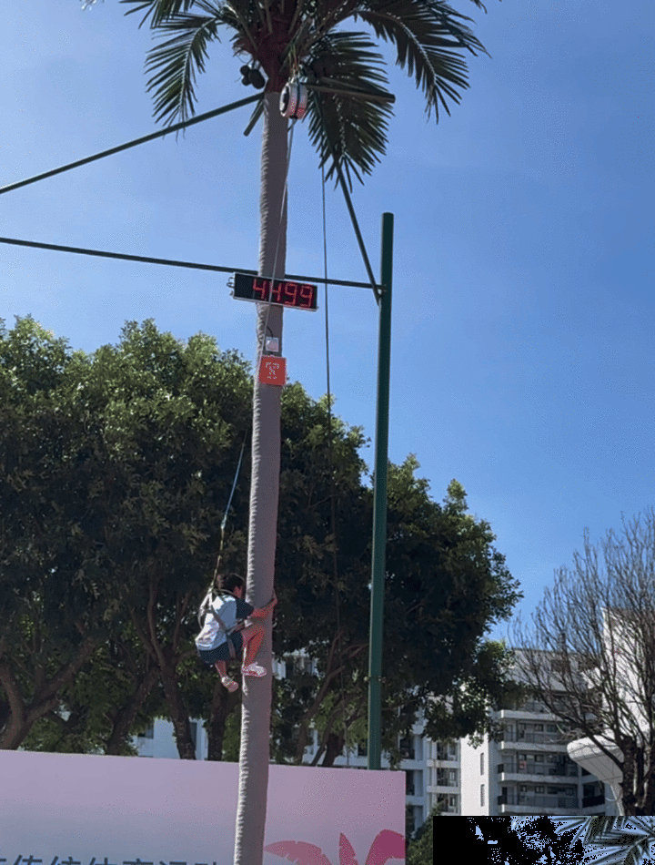 攀椰競(jìng)速設(shè)立男子攀椰9米競(jìng)速和女子攀椰7米競(jìng)速兩個(gè)項(xiàng)目,比賽要求運(yùn)動(dòng)員使用統(tǒng)一提供的攀椰運(yùn)動(dòng)用具,徒手攀爬至椰樹(shù)頂部并按下計(jì)時(shí)器,用時(shí)短者獲勝。