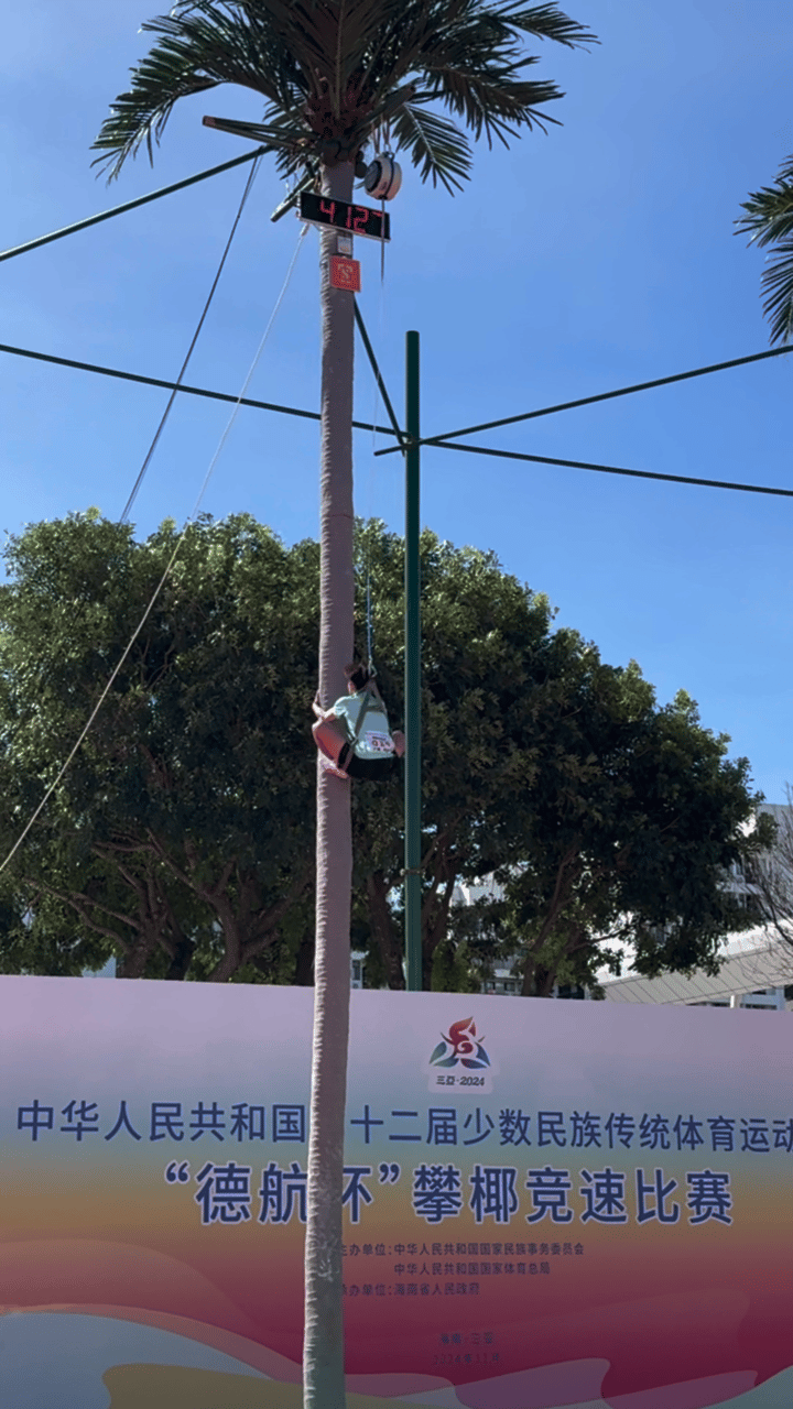 中國(guó)西藏網(wǎng)訊 11月24日,第十二屆全國(guó)少數(shù)民族傳統(tǒng)體育運(yùn)動(dòng)會(huì)攀椰競(jìng)速?zèng)Q賽在三亞市西南大學(xué)三亞中學(xué)體育場(chǎng)舉行。海南代表團(tuán)的羅軍、符詩(shī)軍分別榮獲男子組9米和女子組7米決賽一等獎(jiǎng)。