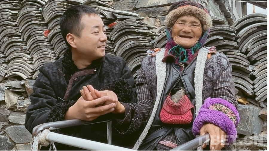 第二個(gè)老師是兩腿癱瘓的獨(dú)居藏族老人斯達(dá)木,是楊斐在第一次下鄉(xiāng)時(shí)遇到的。老人耐心教楊斐藏語(yǔ),楊斐給老人帶去了輪椅、拐杖、紙尿褲等生活用品,兩人感情日漸深厚,他認(rèn)斯達(dá)木老人當(dāng)了干媽。