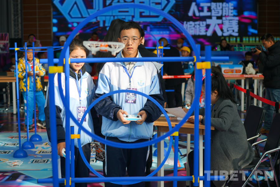 圖為西藏自然科學博物館首屆青少年人工智能編程大賽參賽選手正在進行“無人機”編程項目的比賽 攝影:趙振宇