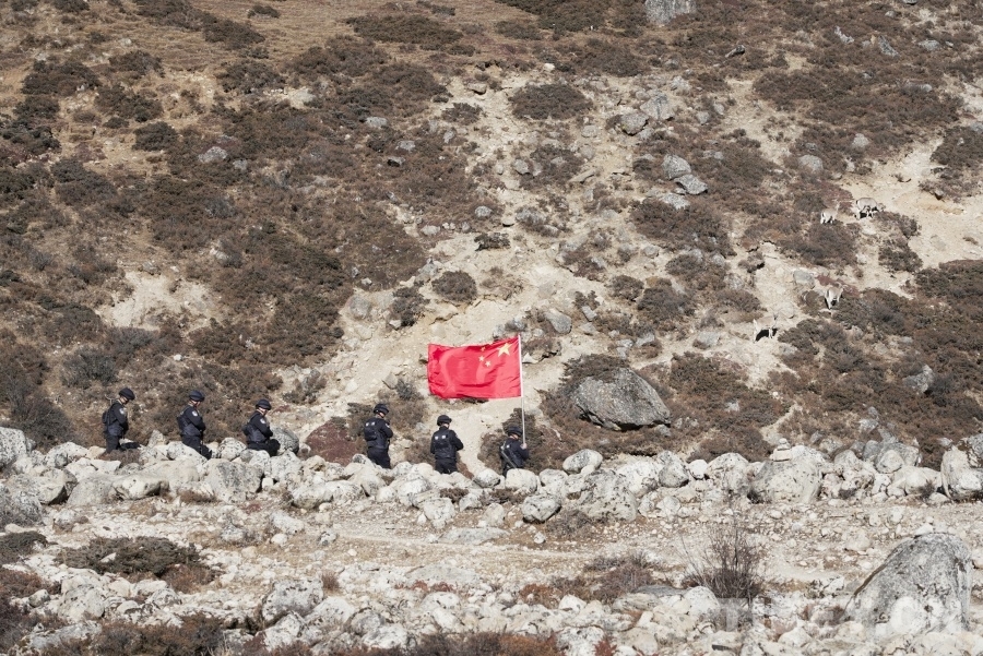 圖為色邊境派出所移民管理警察在巡邏途中與國家二級(jí)保護(hù)動(dòng)物巖羊“同框” 攝影:郭遠(yuǎn)敬