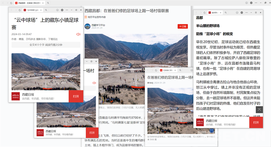 今年一月,延續(xù)七屆的馬利鎮(zhèn)足球“迎新杯”在“爸爸們修建的足球場”開賽的消息備受關(guān)注。一時間,《在爸爸們修建的足球場上踢一場村級聯(lián)賽》《“云中球場”上的藏東小鎮(zhèn)足球賽》《半山腰上的野球場 助推“足球小將”的蛻變》多篇稿件在China Daily、新華社、西藏日報、學習強國、昌都發(fā)布等平臺紛紛亮相,引起不少關(guān)注。