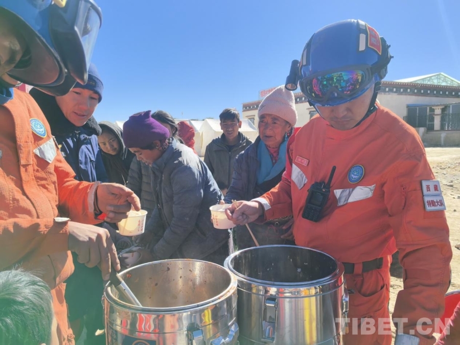 圖為拉薩森林消防大隊救援人員正在為定日縣曲洛鄉(xiāng)措昂村受災(zāi)群眾分發(fā)熱乎乎的燉菜和饅頭 拉薩森林消防大隊供圖