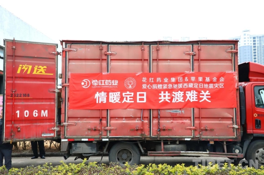 圖為北京蘋果慈善基金會(huì)聯(lián)手廣西花紅藥業(yè)共同向西藏地震災(zāi)區(qū)捐贈(zèng)的物資正在裝車