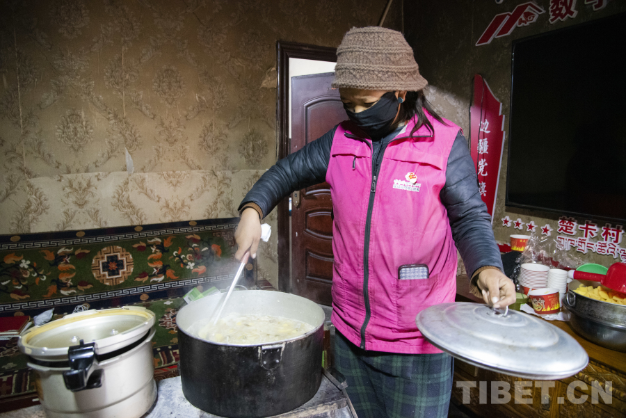 圖為達娃央宗正在廚房內與村巾幗服務志愿者為村莊老人小孩以及工作人員制作午餐 攝影:趙振宇