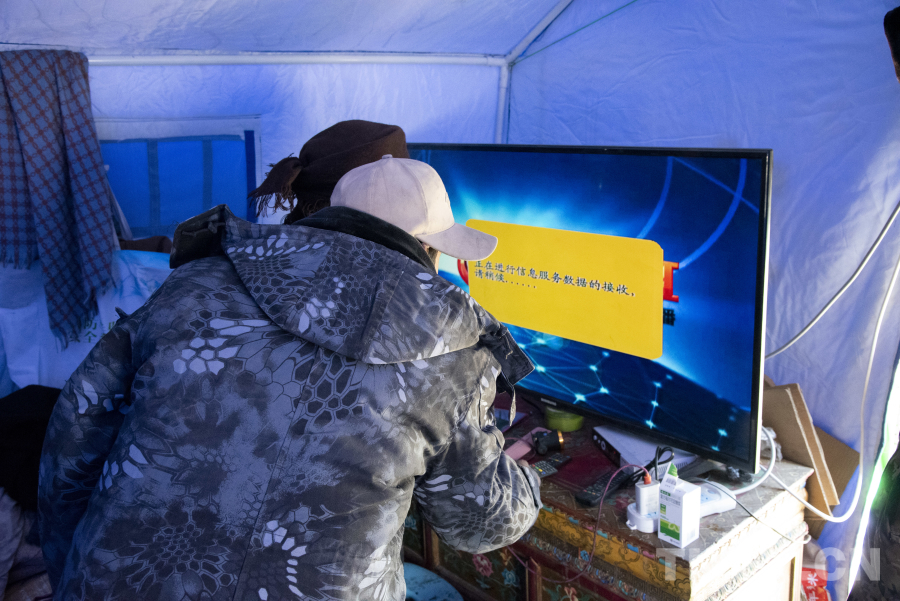 圖為楚卡村安置點村民正在帳篷內調試電視機 攝影:趙振宇