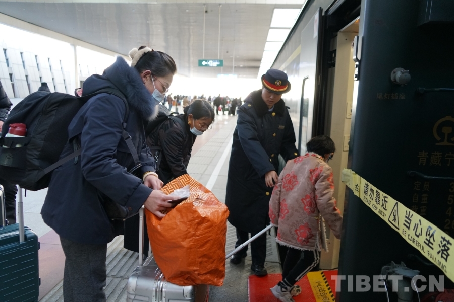 不一會,等待檢票上車的人排起了長隊,他們是來拉薩朝圣結(jié)束準(zhǔn)備回家的藏族老人,他們是結(jié)束了一年工作回鄉(xiāng)過年的外地務(wù)工人員,他們是來拉薩探親的母子,他們是去成都與家人團(tuán)聚的母女三人……短短15節(jié)車廂,囊括了中華民族各族群眾在春節(jié)來臨時短暫相聚于火車上的世間百態(tài):大包小包的行李、火車上準(zhǔn)備的食物、手中的轉(zhuǎn)經(jīng)筒、和媽媽撒嬌的孩子、手機(jī)上跳動的畫面……