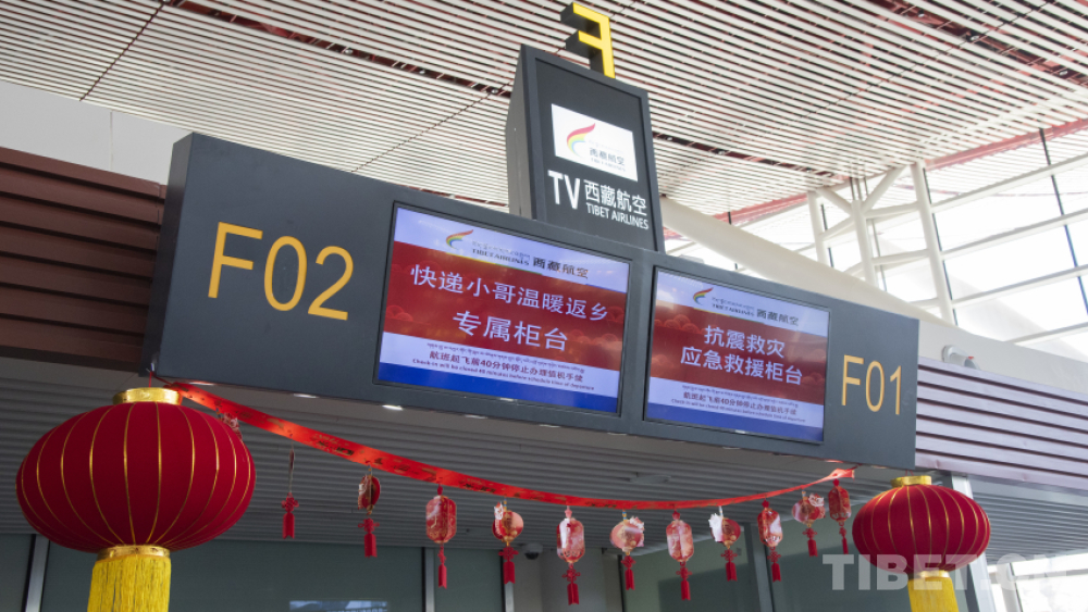 圖為西藏航空開設(shè)的快遞小哥溫暖返鄉(xiāng)專屬柜臺和抗震救災應(yīng)急救援柜臺 攝影:趙振宇