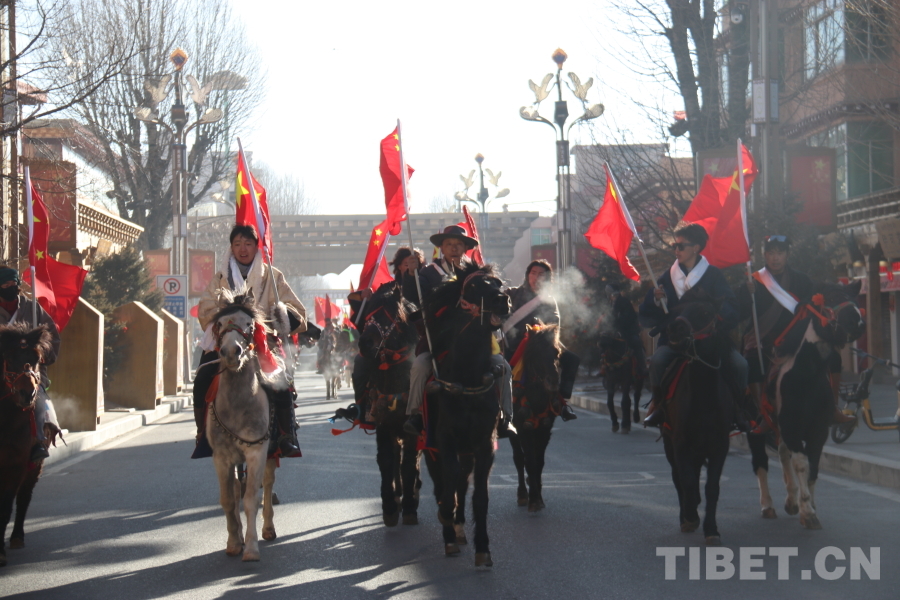 馬術(shù)巡游隊(duì)伍來到理塘東山頂上,俯瞰縣城全景,并展開祝福橫幅,用藏漢雙語高聲祝愿全國(guó)各族人民新春吉祥。