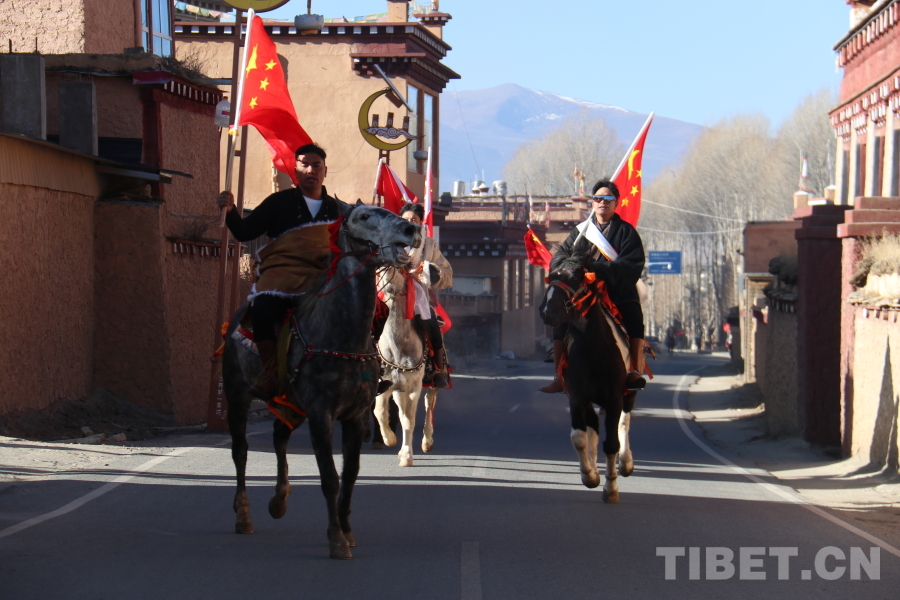 縣城新時(shí)代文明實(shí)踐廣場(chǎng)上擺放著“中華民族一家親,共度中國(guó)吉祥年”的藏式切瑪盒,馬術(shù)巡游隊(duì)伍繞行象征幸福安康的切瑪盒,祈愿風(fēng)調(diào)雨順、五谷豐登,祝福祖國(guó)繁榮昌盛。