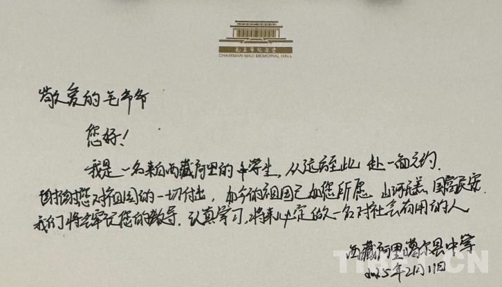 “敬愛的毛爺爺,您好!我是一名來自西藏阿里的中學(xué)生。從遠(yuǎn)方至此,赴一面之約。謝謝您對(duì)祖國的一切付出。如今的祖國如您所愿,山河無恙,國泰民安。我們將牢記您的教導(dǎo),認(rèn)真學(xué)習(xí),將來必定做一名對(duì)社會(huì)有用的人!”