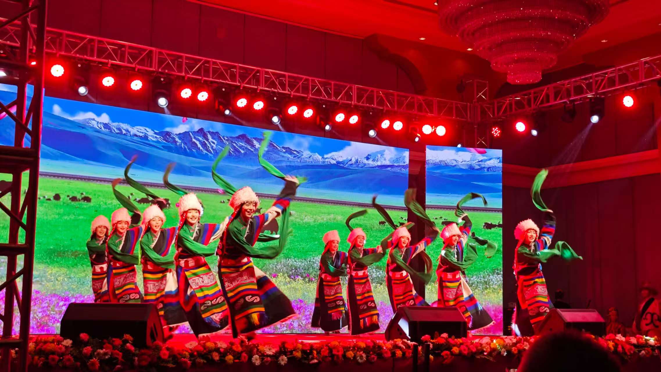 中國西藏山南市藝術(shù)團(tuán)帶來了豐富而精彩的歌舞表演。開場以藏戲《歡騰雅礱》點(diǎn)燃節(jié)日氣氛,獨(dú)唱《扎西德勒》《歡騰的弦子》以及尼泊爾籍藏族女歌者瓊英卓瑪演唱《花的眼睛》,贏得觀眾陣陣掌聲,《祥瑞勒布》《織夢》《藏南鼓舞》《班戈諧欽》《弦鼓情緣》《高原舞步》等舞蹈表演體現(xiàn)了西藏各族群眾豐富的精神文化生活,展現(xiàn)了西藏日新月異的發(fā)展變化和迷人的民族風(fēng)情,在場藏胞紛紛為精彩演出鼓掌喝彩。