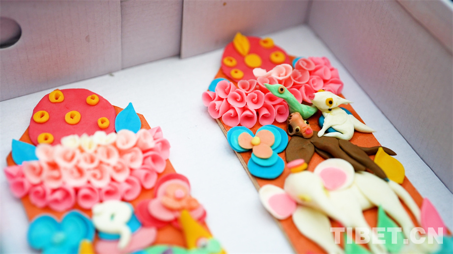 在拉薩市最大的年貨市場(chǎng)八廓商城的東側(cè),售賣酥油花的攤位整齊排列。經(jīng)營(yíng)者大多是50歲以上的中年人,他們有豐富的手工酥油花制作經(jīng)驗(yàn),主要以家庭作坊的形式制作售賣,幾個(gè)隨手可拎起的鞋盒就是他們的“商鋪”。和氣四瑞、長(zhǎng)壽六寶、吉祥八寶,經(jīng)營(yíng)者們用自己的巧手捏制出不同的圖案,將家庭和睦、健康長(zhǎng)壽、吉祥如意的寓意帶給一戶又一戶人家。