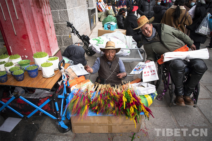 普瓊,來(lái)自日喀則市江孜縣,在八廓商城南門前經(jīng)營(yíng)著自己的“羅薩梅朵”小攤。初見普瓊,我們被他沖著鏡頭的燦爛笑容所吸引。細(xì)細(xì)觀察,普瓊坐在地上的身高卻比別人矮了一大截?!拔覀儚睦_堆龍德慶的批發(fā)市場(chǎng)上買來(lái)這批‘羅薩梅朵’在此銷售,就希望能夠在年前的這段時(shí)間多賺些小錢補(bǔ)貼家用,所有人都想在新年之時(shí)過(guò)個(gè)充裕的‘好年’,不是嗎?”普瓊因一次意外高位截癱,失去雙腿的他并沒(méi)有消沉。他選擇積極面對(duì)生活,用自己的雙手和命運(yùn)抗?fàn)?,用?jiān)強(qiáng)和勤勞讓自己和全家過(guò)上更好的生活。與普瓊不幸的經(jīng)歷相比,我們每個(gè)人過(guò)的每個(gè)年何嘗不都是一個(gè)個(gè)“好年”呢?普瓊對(duì)生活的那種熱愛,對(duì)明天會(huì)更好的堅(jiān)定,何嘗不是我們對(duì)每一個(gè)“好年”所孜孜追求的呢?