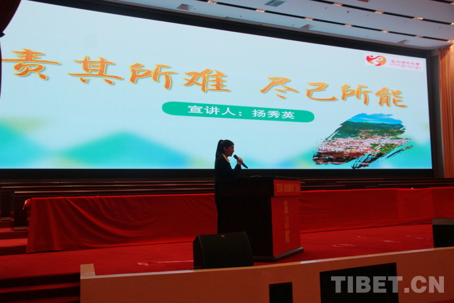 圖為攀枝花市農(nóng)業(yè)農(nóng)村局干部揚(yáng)秀英講述該局黨組成員、副局長(zhǎng)寧秀蓉的援藏故事 攝影:劉莉