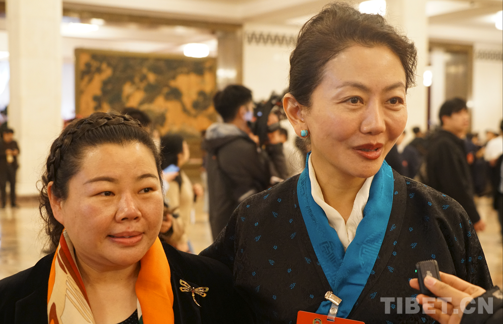 圖為全國(guó)政協(xié)委員邊巴拉姆(右一)接受記者采訪 攝影:楊眉笑