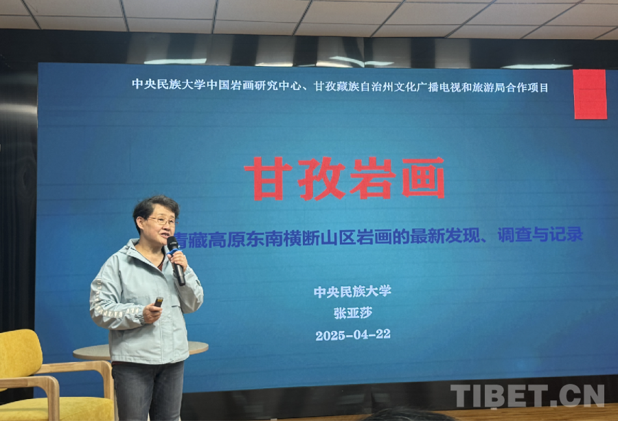 圖為《甘孜巖畫》主編、中央民族大學(xué)中國巖畫研究中心教授張亞莎作分享