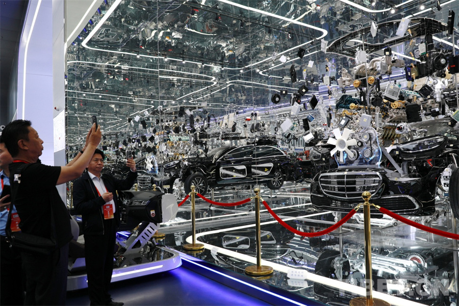 圖為西藏自治區(qū)工商聯(lián)民營企業(yè)家赴京學習參觀團一行在北方國際汽車教育拍攝奔馳整車吊裝爆炸式工業(yè)藝術展示 攝影:劉莉