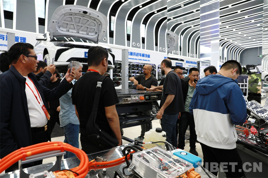 “這是由7104節(jié)電池組成的特斯拉的電池組,它是402伏的高壓電。所以,沒有經(jīng)過專業(yè)培訓進行電動汽車維修會有一定的危險性?!北狈絿H汽車教育展廳、車間負責人黨超為到訪的西藏自治區(qū)工商聯(lián)民營企業(yè)家赴京學習參觀團一行詳細介紹著墻上展示的電池組。大家聽得津津有味。